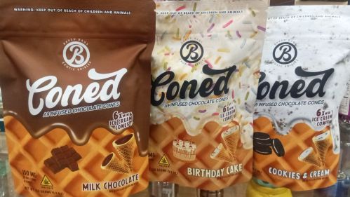 CONED – CHOCOLATE Coned are delicious mini sugar cones filled with rich Delta-8 THC chocolate. As a kind of chocolate delta-8 THC edible treat, they deliver a powerful head and body experience that will have you feeling at ease. Enjoy the best part of a sundae cone while feeling the incredible effects of Delta-8 THC! Our Delta-8 THC cones feature 150mg of Delta-8 THC in each bag for maximum effects. 6 cones per bag equaling 25 mg each cone. Enjoy our edible delta-8 THC chocolate cones we have them in our two different flavors, milk-chocolate and cookies and cream.